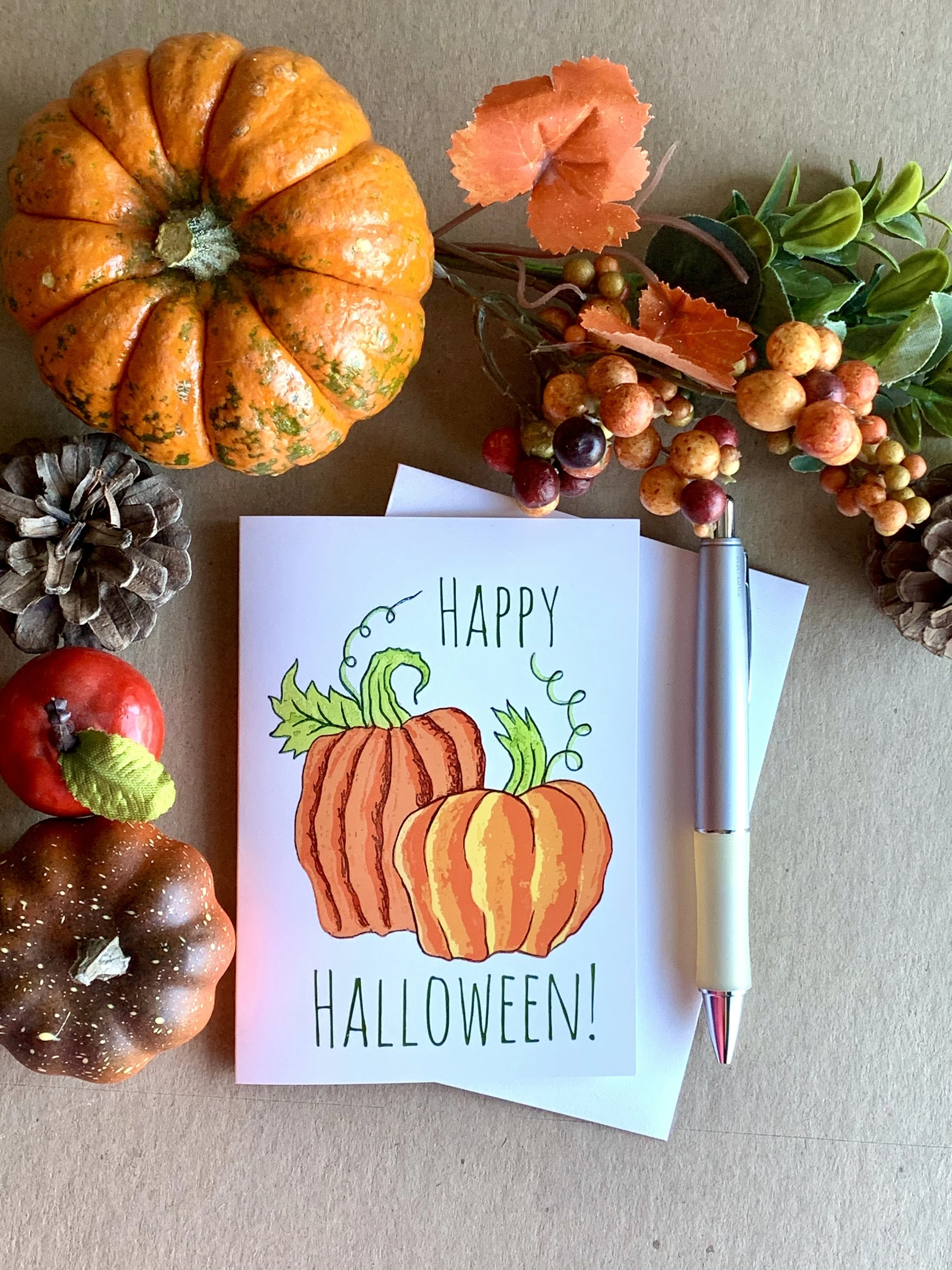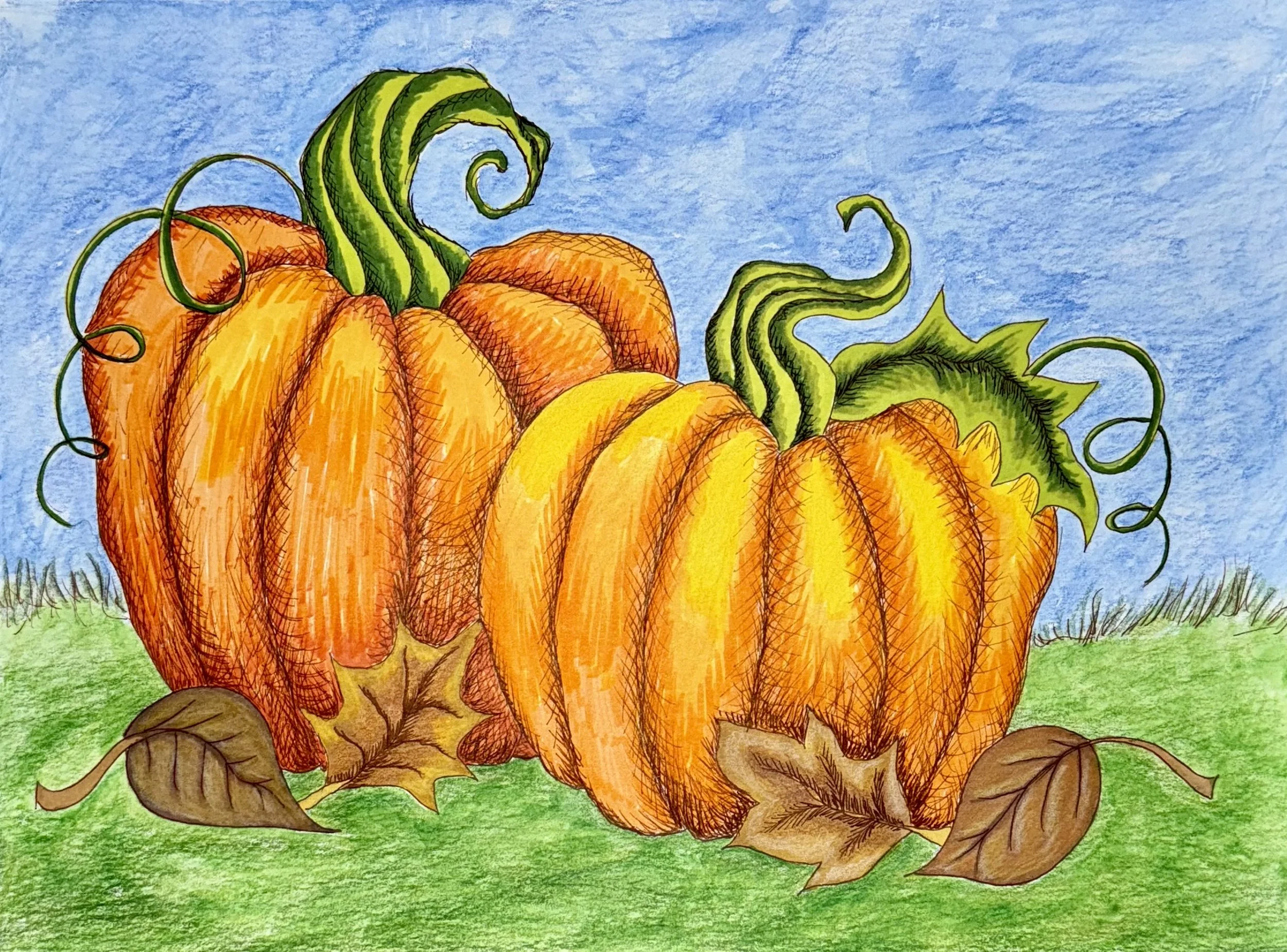 “Pair of Pumpkins and Leaves” Watercolor pencil and pen