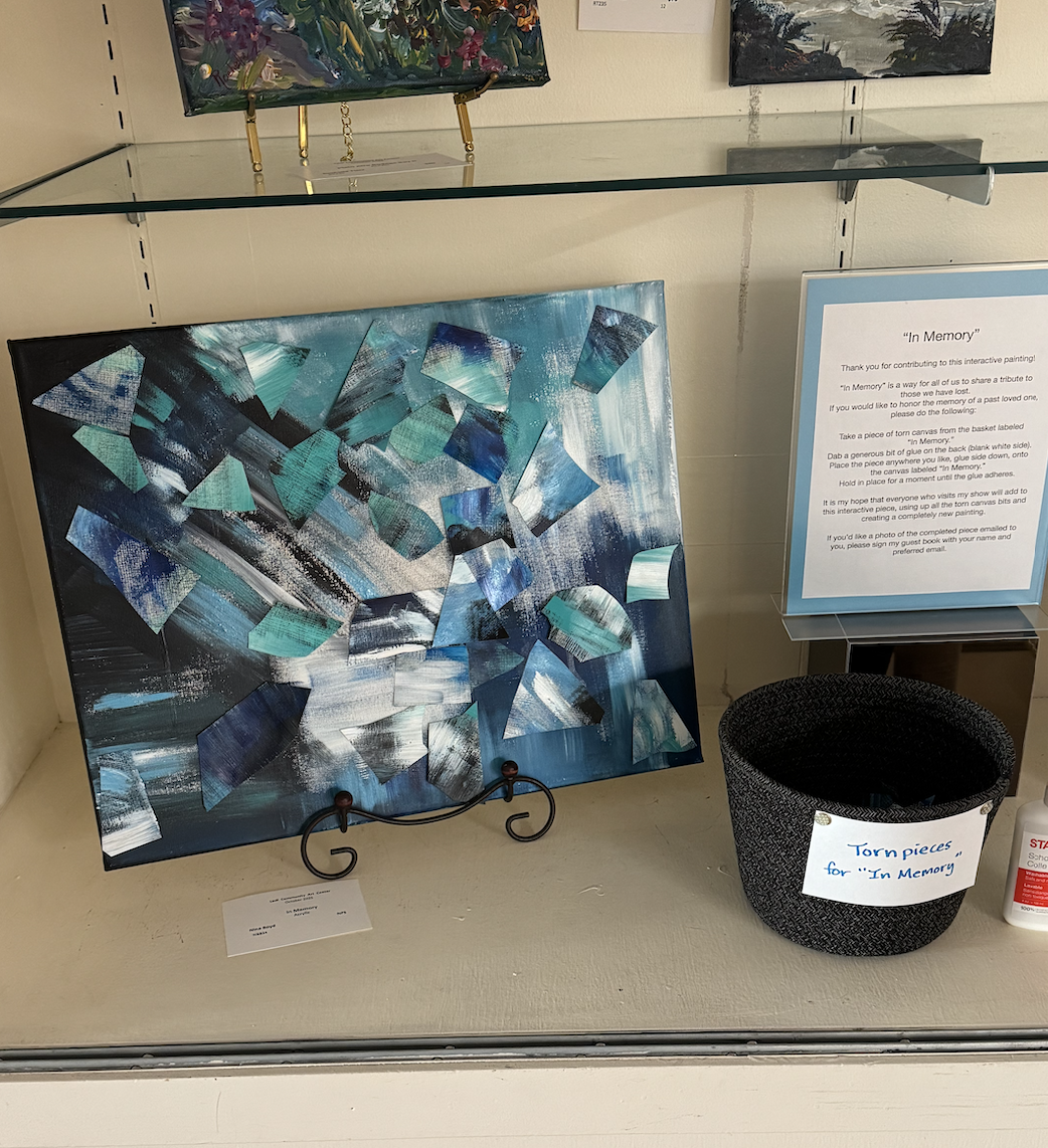 While you are visiting my studio stop, be sure to check out my “Life is But a Dream” show and also add to the two interactive paintings. “In Memory” and “In Celebration” each have baskets of mosaic pieces next to them that visitors can glue onto the canvases, eventually creating a whole new tapestry over them to reflect those we’ve lost from our lives and those we’ve welcomed into our lives.